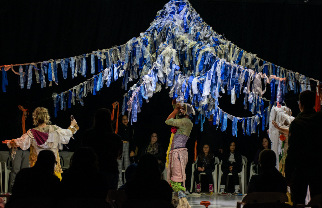 Um pássaro aparece para dois viajantes, Aurora e Perigeu, e os leva até um “vão do mundo”. Nesse lugar, amontoado às ruínas de tudo aquilo que foi ou vai ser um dia, vive Terreno. Ali, os três passam a compartilhar a mesma terra e testemunham a anunciação de uma tempestade devastadora. Para sustentar o céu e conseguir tecer o amanhã, os viajantes são convocados a deixar pelo caminho tudo aquilo que precisa morrer.