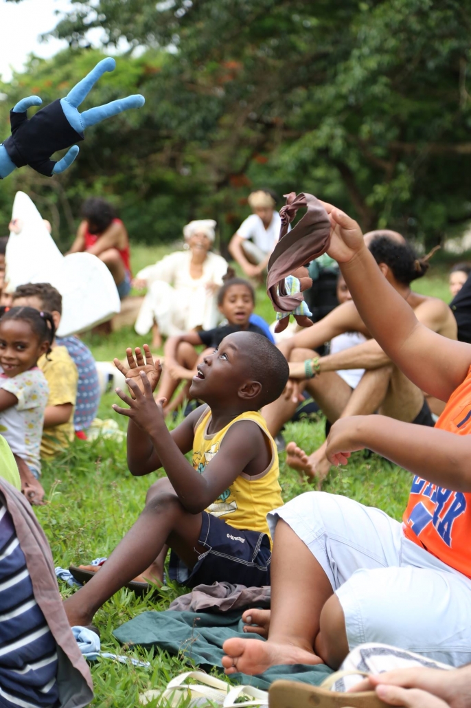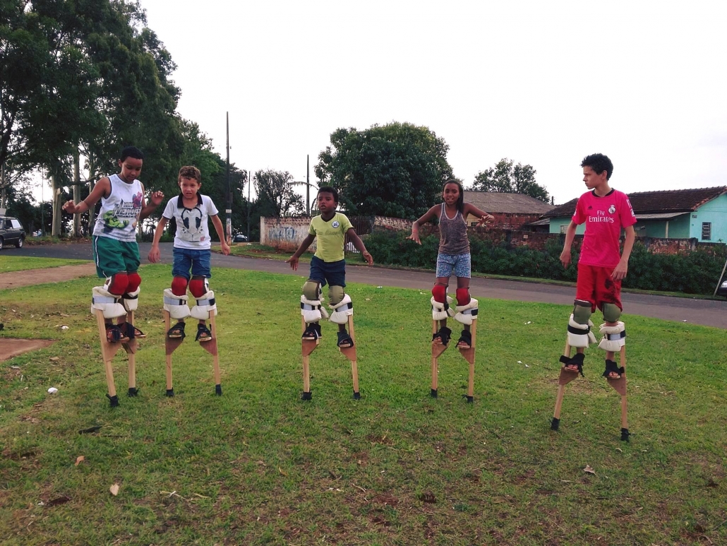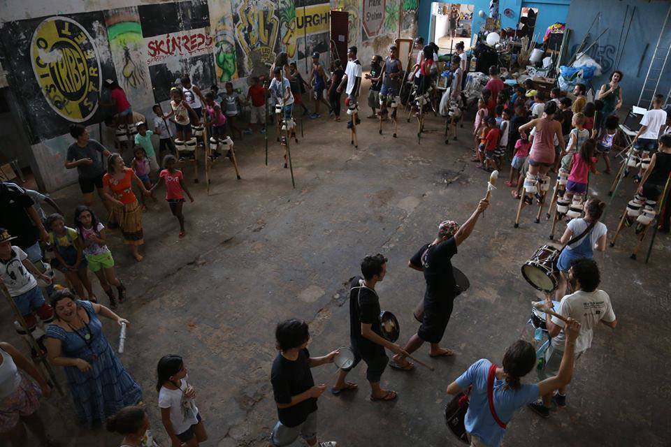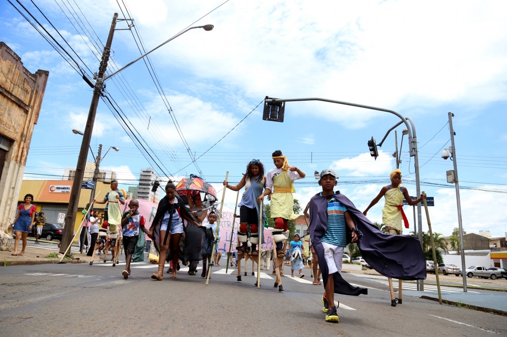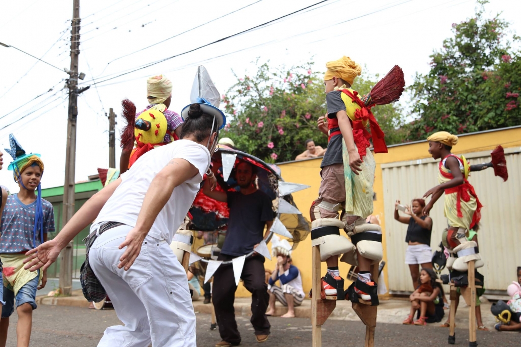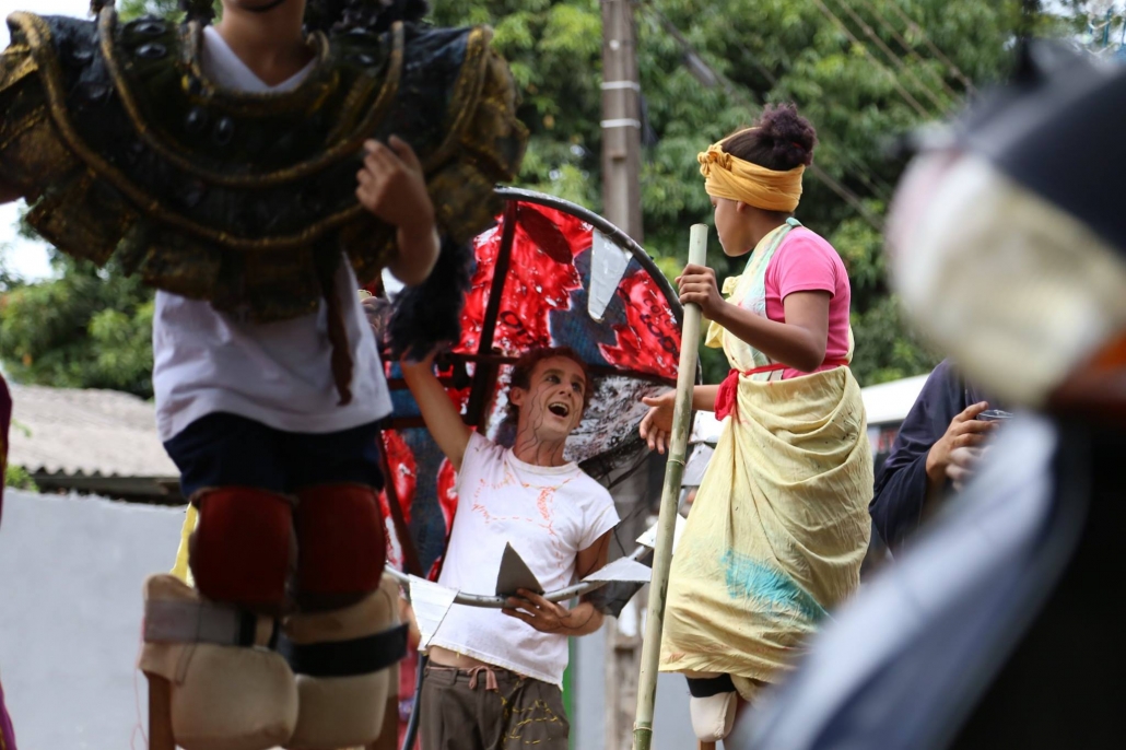Cada bairro contou com três oficineiros que trabalharam teatro, perna de pau, figurino e outras linguagens artísticas com seus respectivos alunos.